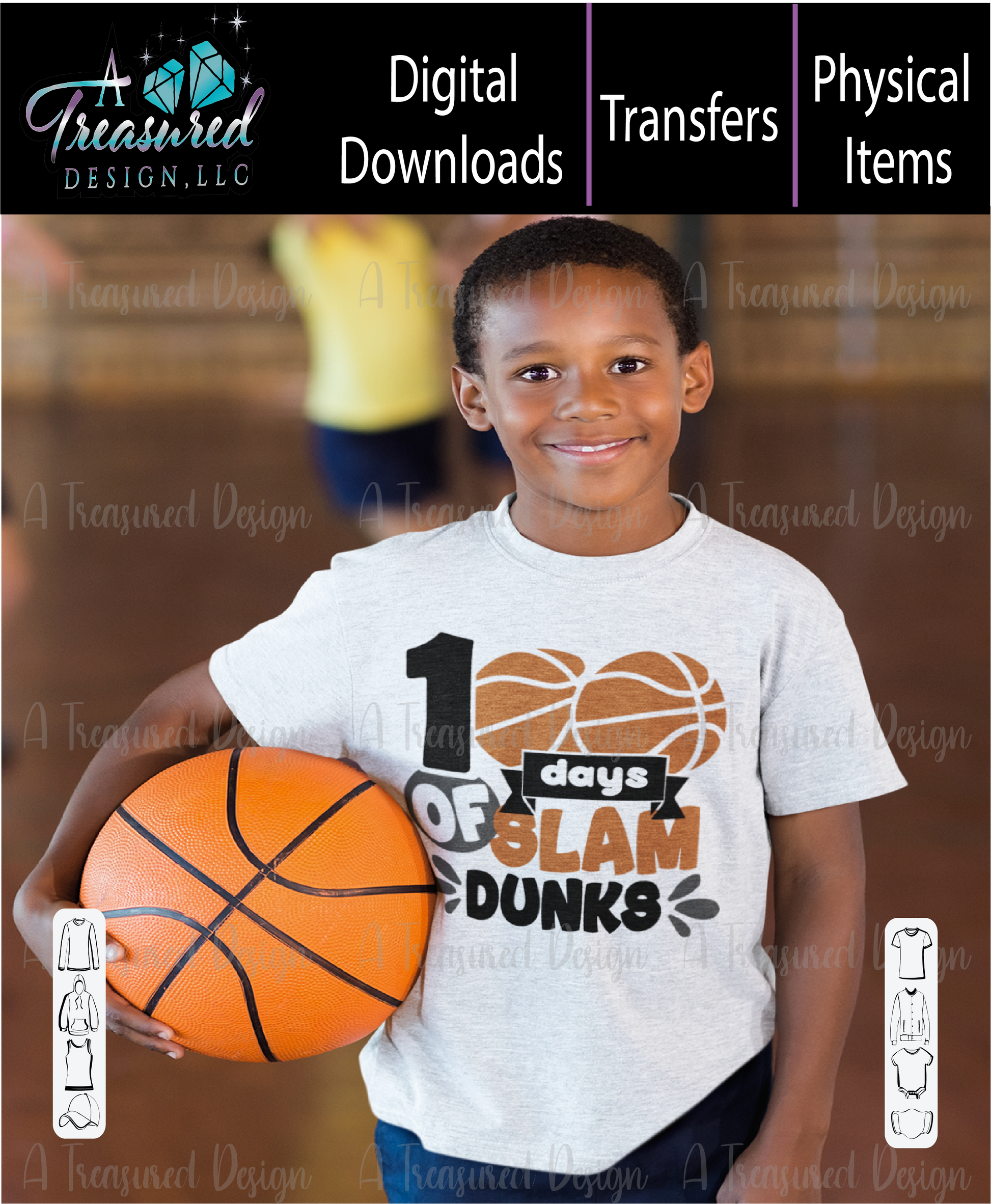 Looking for high-quality school related heat transfers? Look no further than A Treasured Design LLC! Our "100 Days Of Slam Dunks" heat transfer design is perfect for celebrating a milestone.
