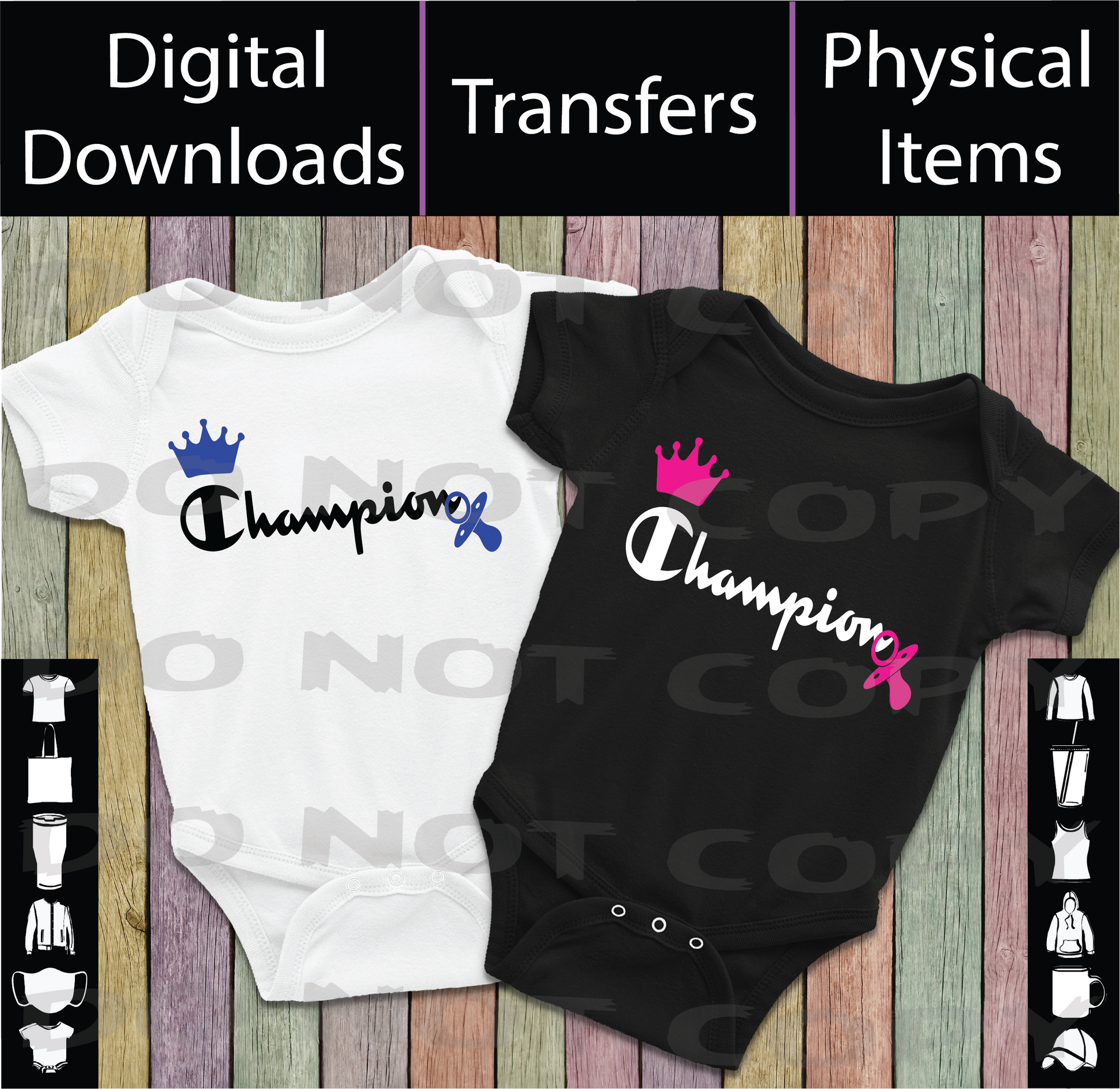 Introducing our Champion Baby DIY Heat Transfers—a stylish way to dress your little one like the champion they are! Inspired by the iconic Champion Clothing brand, these transfers feature the Champion logo adorned with a crown and a pacifier, specially designed for babies. Available in glitter for an extra touch of sparkle and in multiple sizes, these transfers offer versatility for all your baby's apparel needs. Choose from two charming options for boys—blue and white or blue and black—and two adorable choices for girls—pink and white or pink and black. Make your baby stand out with our Champion Baby DIY Heat Transfers. Shop now and let your little one shine!
