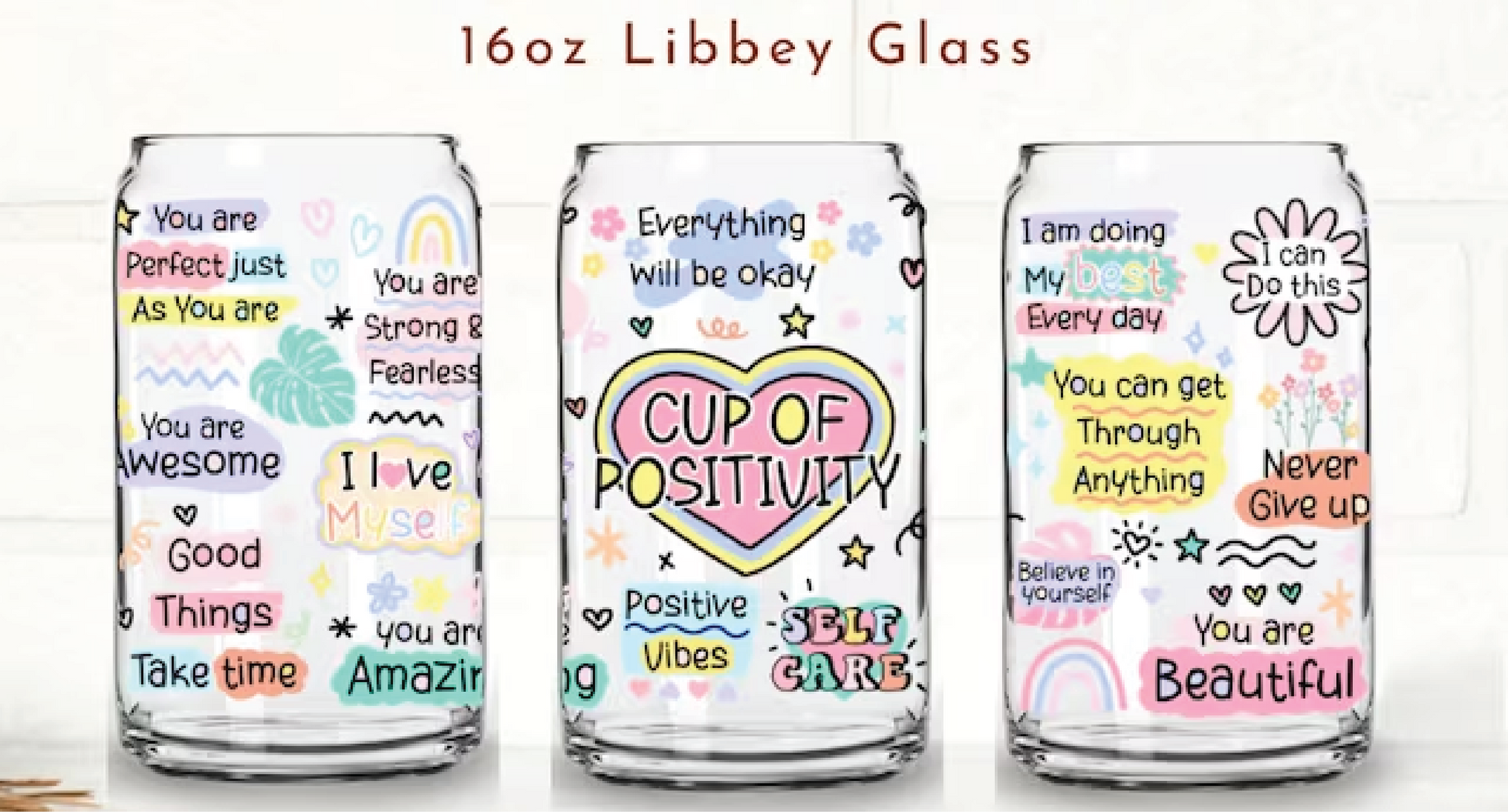 Cup Of Positivity 16oz Libby Glass with Lid and Straw