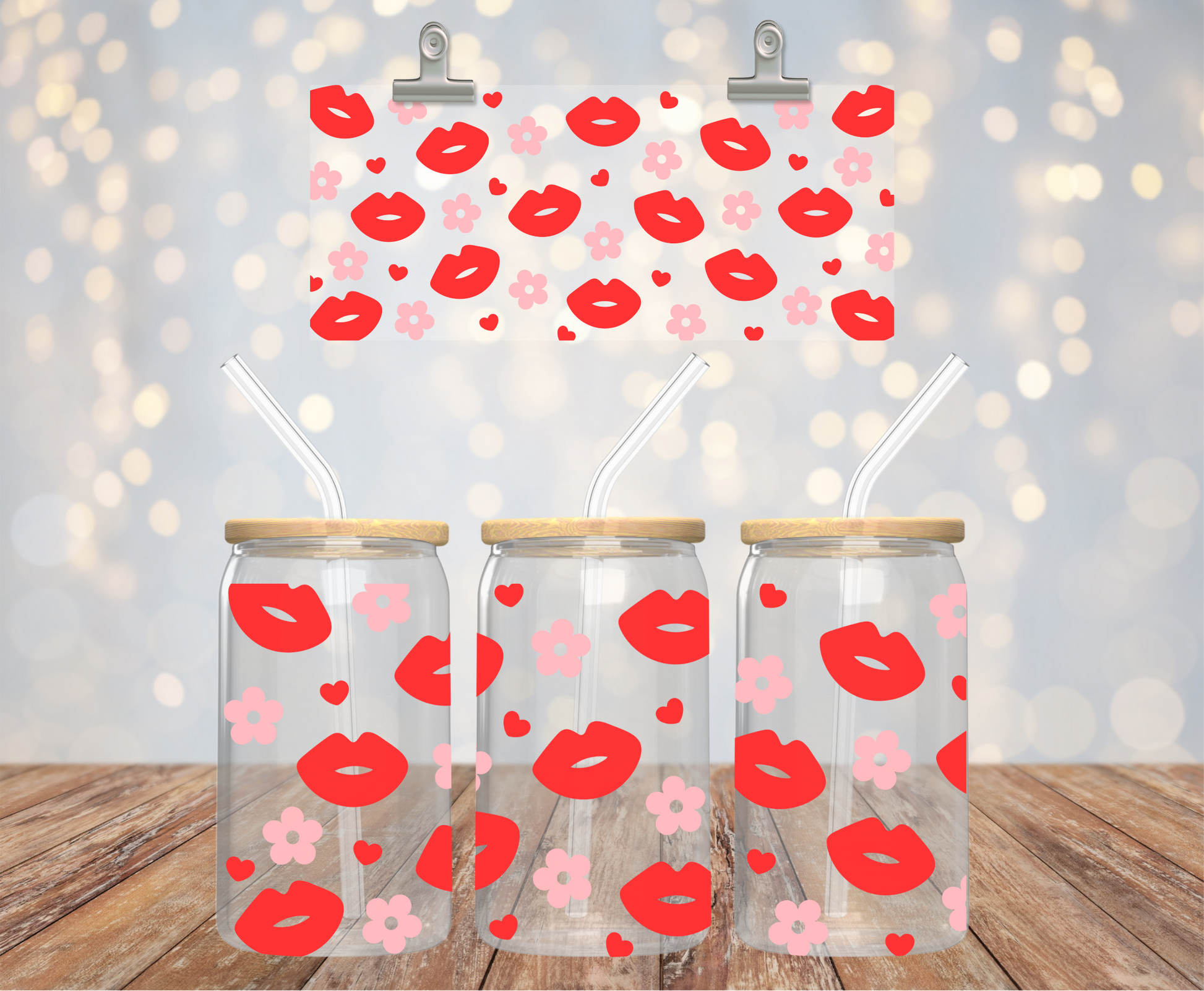Flowers and Kisses 16oz Libby Glass with Lid and Straw