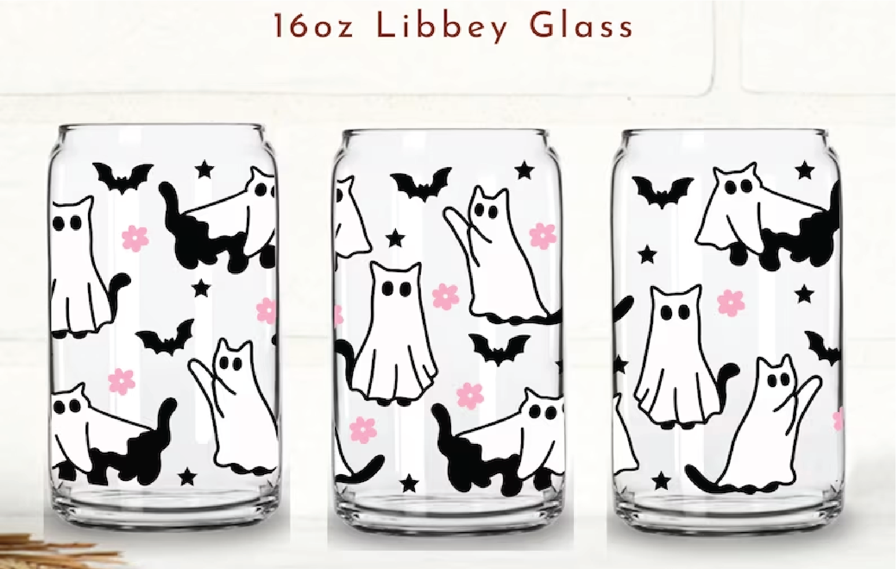 Looking for a spooky and refreshing cup this fall + Halloween? This Halloween ghost cats-themed iced coffee soda can Libbey 16oz glass is the perfect accessory for spooky season loving ghouls and goblins.