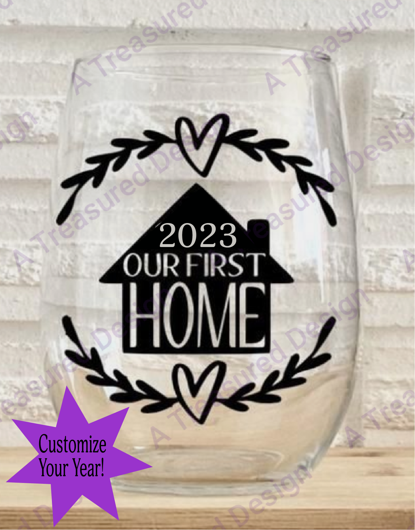 Our First Home Stemless or Stem Wine Glass Housewarming Gift for New Homeowners