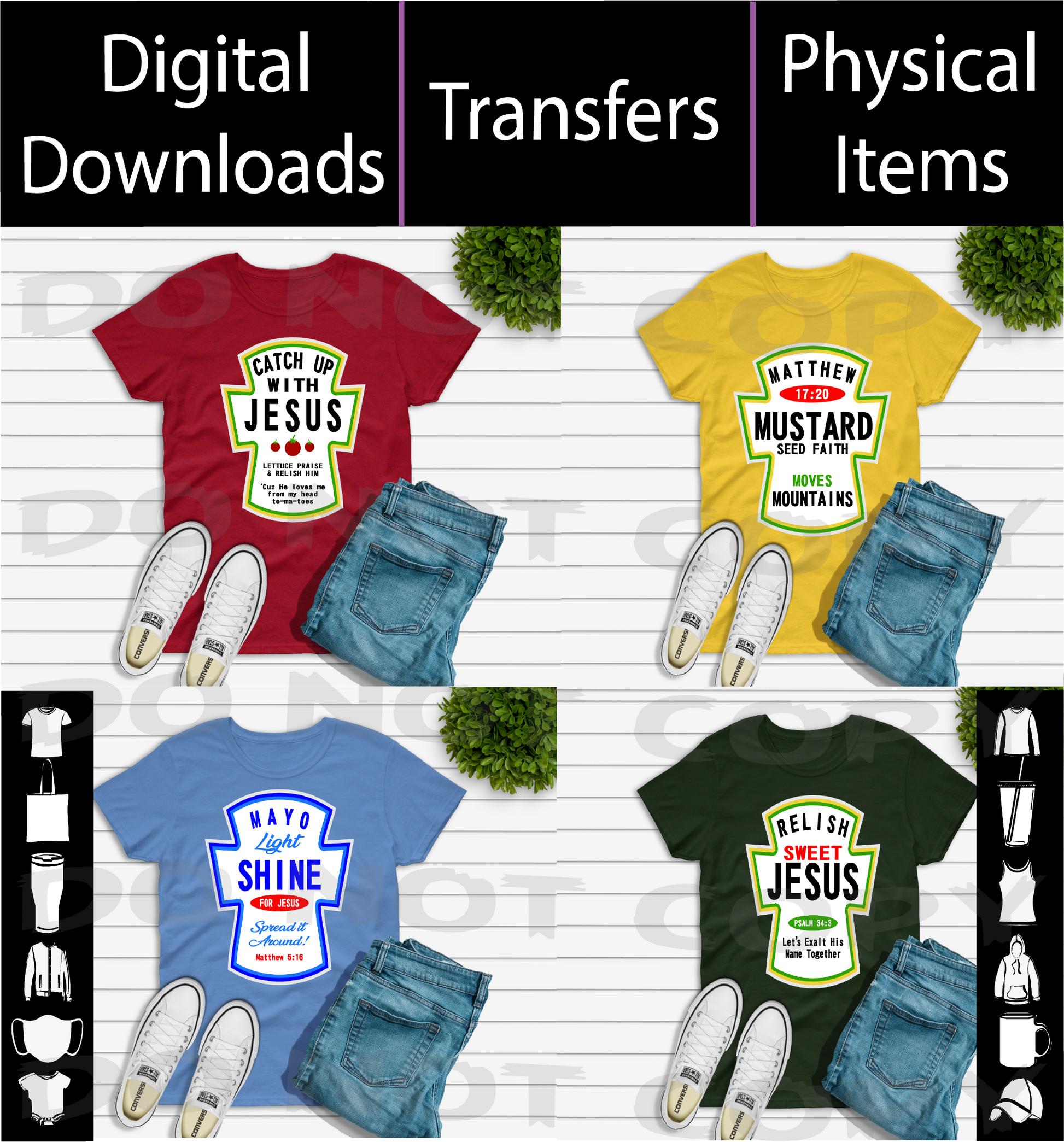 Introducing our Religious Food Bundle Collection—a unique blend of faith and flavor! These t-shirts, sweatshirts, and hoodies feature whimsical designs of four food ingredients—Ketchup, Mayo, Relish, and Mustard—each with a religious twist. From "Ketch up with Jesus" to "Mustard seed faith moves mountains," these garments celebrate faith in a fun and creative way. Available in multiple sizes for a perfect fit, and if you need a custom color, just let us know in the note box during checkout. Wear your faith with style and shop our Religious Food Bundle Collection today!